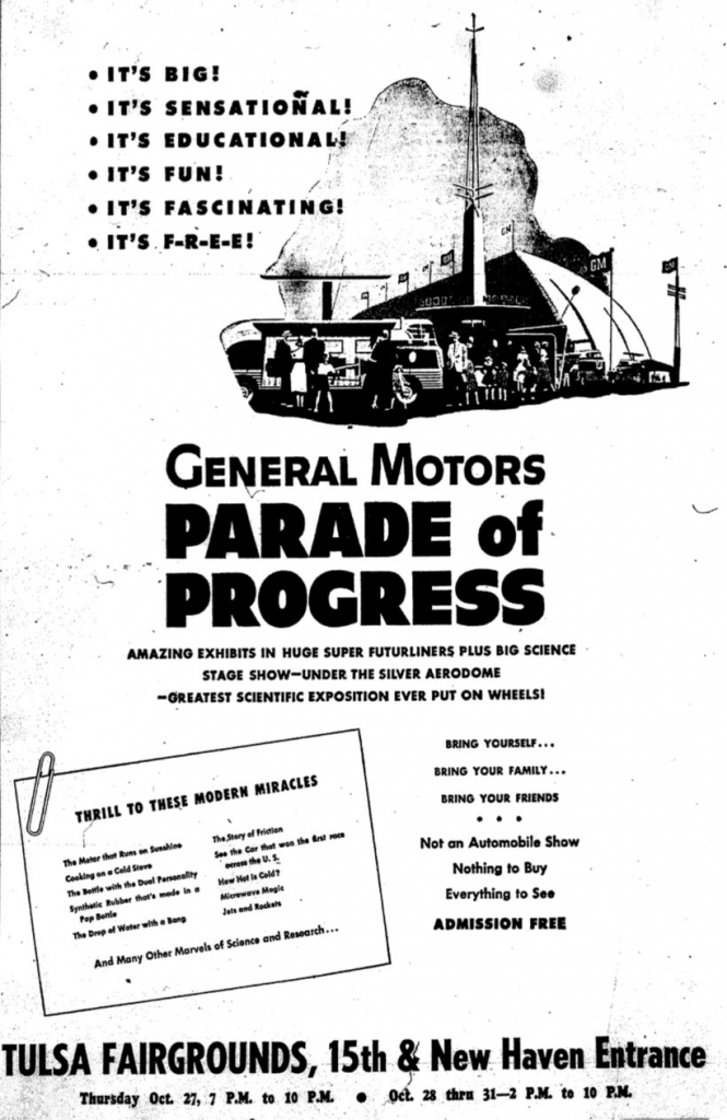 The Futurliner has visited Tulsa twice before at the Tulsa Fairgrounds as part of the Parade of Progress – in 1941, prior to the attack on Pearl Harbor, and again in 1955. With the increased popularity of television and other growing technologies, the Parade of Progress eventually retired and the Futurliners became a memory of the past. However, efforts were made to restore some of these 12 items of Americana, with Joe Bortz eventually donating the Futurliner #10 to the National Automotive and Truck Museum in Auburn, Indiana. The remaining Futurliners remain in private ownership or sit unrestored.